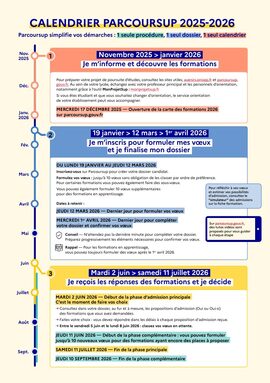 Par Patrick Manuelli, publié le lundi 20 octobre 2025 09:50 - Mis à jour le lundi 20 octobre 2025 09:53Retrouvez en pièce jointe de cette actualité le calendrier PARCOURSUP 2025-2026. Deux réunions d'information à destination des parents d'élèves de terminale sont programmées. Le 18 décembre pour la voie professionnelle et le 6 janvier pour la voie GT
